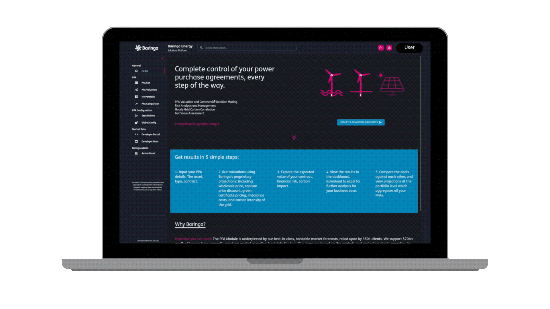 Energy Source is powered by Baringa's fundamental power market modelling capabilities, spanning more than 60 markets and leveraging the insight of energy experts with a wealth of experience in PPA and energy procurement on both sides of the corporate and generator value chain. We are able to support you from the first steps of developing your energy procurement strategy and targets, to assessing offers, and managing and reporting on the portfolio on an ongoing basis. The software itself has been built in-house by our capabilities team. |